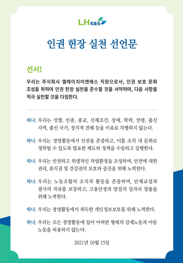 LH E&S 전 직원은 공정한 직무수행을 방해하는 어떠한 불법 및 부당 요구도 단호히 거부하며